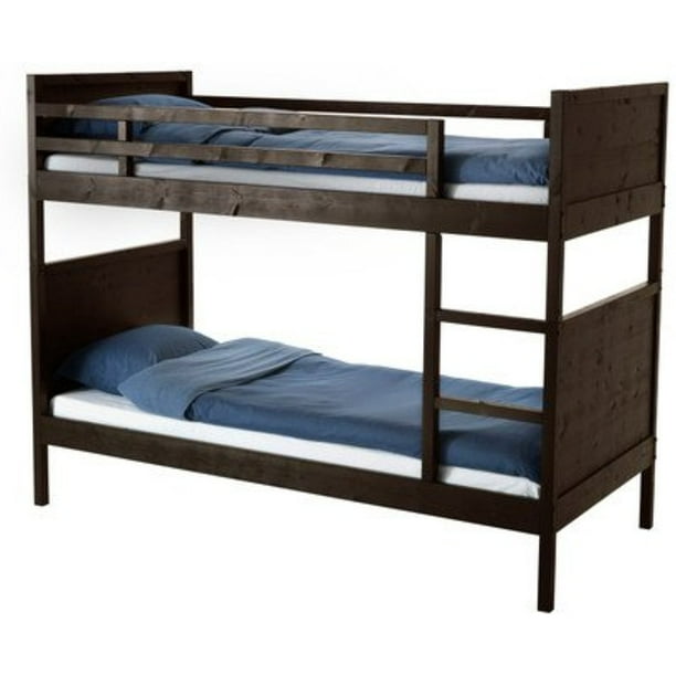 After looking around, we chose this model and are very happy we did. Well, assembling this thing is birth control. And if no one's sleeping there, the lower bunk can be used as a sofa. We stripped and stained the ikea bed dark brown and added faux bois white wallpaper to the sides of the bunks. The loftiness of the bed creates a personal space underneath each one.